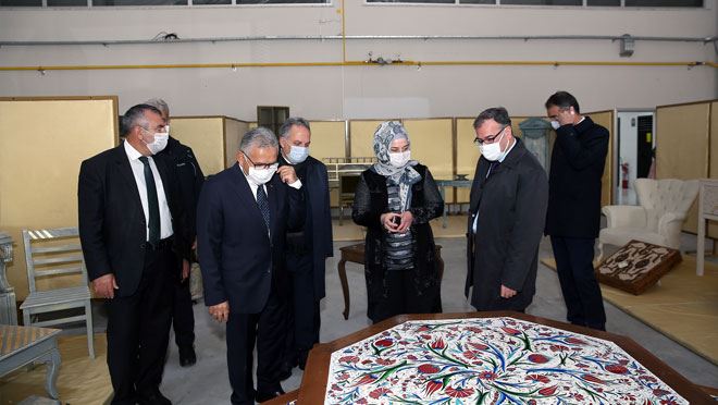 Kayseri Büyükşehir Belediye Başkanı Dr. Memduh Büyükkılıç, Talas Belediye Başkanı Mustafa Yalçın ve Hacılar Belediye Başkanı Bilal Özdoğan ile birlikte atıl kalmış mobilyaların geri dönüşüme kazandırıldığı KAYMEK Sanat Merkezi’nde incelemelerde bulundu.