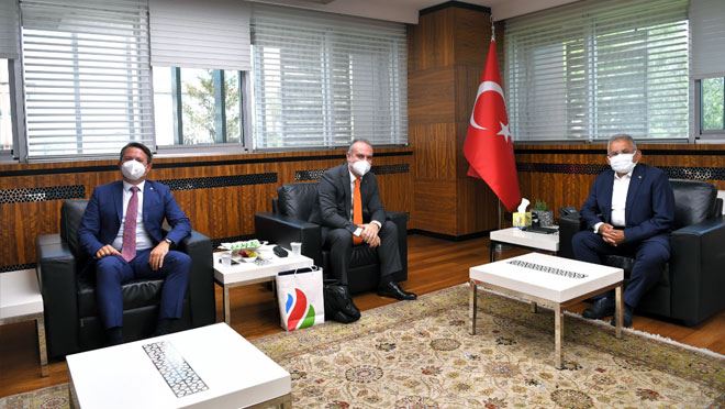 Büyükşehir Belediye Başkanı Dr. Memduh Büyükkılıç, Kayserigaz’ın Azerbaycanlı ana firması SOCAR Türkiye Doğalgaz İş Birimi Başkanı Yalçın Aliyev ve SOCAR Doğalgaz Dağıtım Başkanı Ertan Yıldız’ı makamında kabul ederek ilçelere yapılan doğalgaz yatırımlarına ilişkin istişarelerde bulundu.