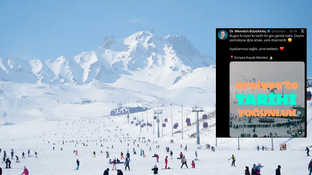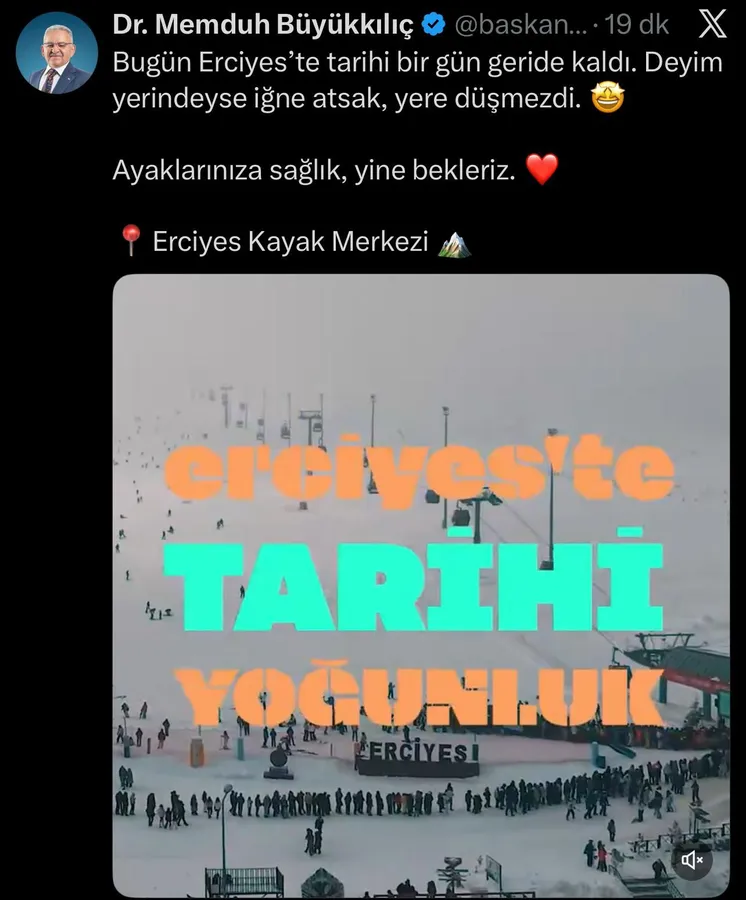 Büyükkılıç paylaşımında, “Bugün Erciyes’te tarihi bir gün geride kaldı. Deyim yerindeyse iğne atsak yere düşmezdi” ifadelerini kullanarak kayak merkezindeki yoğunluğa dikkat çekti.