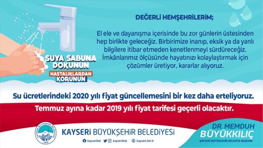 Kayseri Büyükşehir Belediye Başkanı Dr. Memduh Büyükkılıç, su ücretlerindeki 2020 yılı fiyat güncellemesini Temmuz ayına kadar ertelediklerini belirterek, tüm abonelerin 2019 yılı fiyat tarifesinden suyu kullanabileceklerini açıkladı.