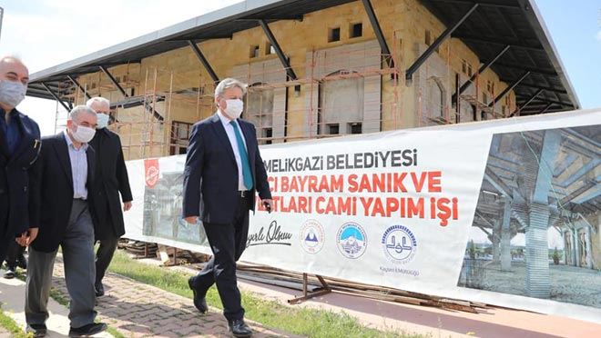 Melikgazi Belediye Başkanı Mustafa Palancıoğlu, Melikgazi Belediyesi, Kayseri İl Müftülüğü, Erciyes Üniversitesi ve Hayırsever Hacı Bayram Sanık işbirliği ile Erciyes Üniversitesi’nde yapılan Hacı Bayram Sanık ve Evlatları Cami’nin inşaatında incelemelerde bulundu.