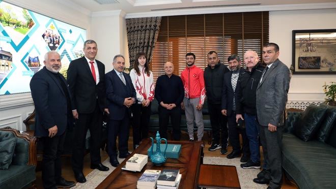 Ziyaret sonunda Başkan Yalçın sporculara ve teknik ekibe altın, kitap ve kalemden oluşan hediye takdiminde bulundu.