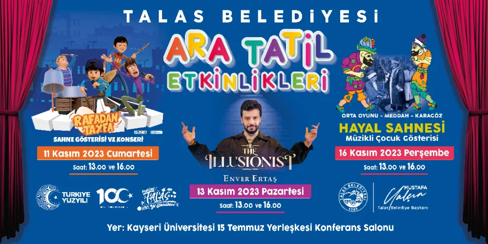 Festival Talas 100. Yıl Etkinlikleri çerçevesindeki gösteriler ara tatilin ilk günü olan 11 Kasım Cumartesi günü başlayacak. Çocuklar tarafından büyük bir ilgiyle izlenen çizgi film Rafadan Tayfa’nın sahne gösterisi ve konseri çocuklara keyifli anlar yaşatacak. Cumartesi günü iki seans halinde gerçekleşecek olan program, 13.00 ve 16.00 saatlerinde başlayacak.
