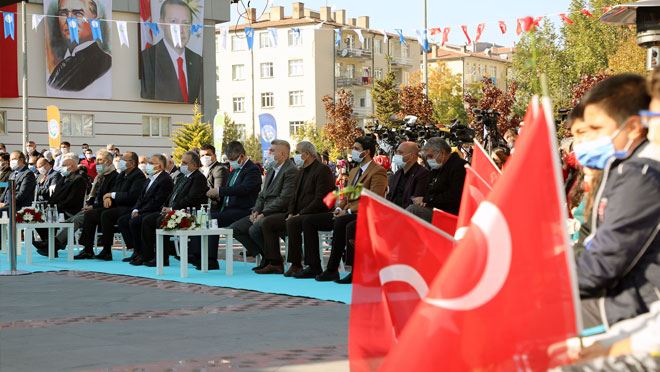 Belediye Meydanı’nda düzenlenen törene AK Parti Genel Başkan Yardımcısı Mehmet Özhaseki ve Büyükşehir Belediye Başkanı Memduh Büyükkılıç’ın yanı sıra milletvekilleri, siyasi partilerin il ve ilçe başkanları, meclis üyeleri, davetliler ve eğitim camiası ile öğrenciler katıldı.