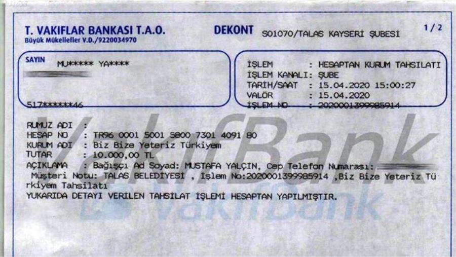 Geçtiğimiz günlerde Cumhurbaşkanı Recep Tayyip Erdoğan'ın 7 maaşını bağışlayarak başlattığı 'Biz Bize Yeteriz Türkiyem' kampanyasına, Talas Belediye Başkanı Mustafa Yalçın da 10 bin TL destekte bulundu. Başkan Yalçın sosyal medya hesabından yaptığı bağışın dekontunu paylaştı.