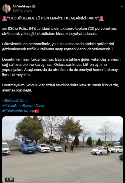 "636'sı polis, 84'ü jandarma olmak üzere toplam 720 personelimiz, sivil olarak yolcu gibi otobüslere binerek seyahat edecek. Görevlendirilen personelimiz, yolculuk esnasında otobüs şoförlerini gözlemleyerek trafik kurallarına uyup uymadıklarını denetleyecek. Denetimlerimizin tek amacı var, bayram tatiline giden vatandaşlarımızın sağ salim ailelerine kavuşması, onlara sarılması. Lütfen aşırı hız yapmayalım. Araçlarımızda da otobüslerde de emniyet kemeri takmayı ihmal etmeyelim. Unutmayalım, yolculuklar sizleri sevdiklerinize kavuşturmak için vardır, ayırmak için değil."
