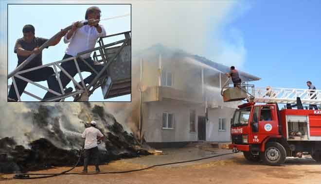 Kayseri´nin Akkışla ilçesinde çıkan ve 5 bin adet saman balyasının kül olduğu yangına Akkışla Belediye Başkanı Ali Ergül itfaiye merdivenine çıkarak müdahale etti.