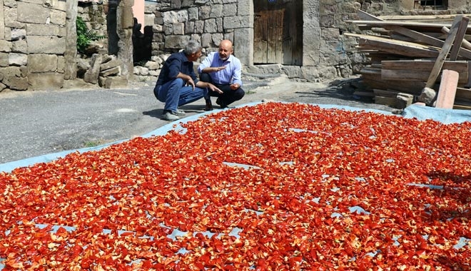 Bahçelerden toplanan biberler, genellikle evlerin damlarında ve yanlarındaki boş alanlarda, okul bahçelerinde ve cami önlerinde kurutuluyor.