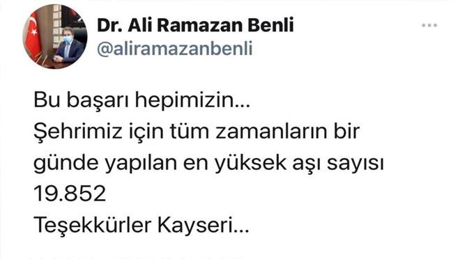 Covid 19 ile mücadele kapsamında yurt genelinde yürütülen çalışmalar hız kesmeden sürüyor. Aşılama çalışmalarında ülke genelinde yakalanan rüzgar ilimize de etkili olurken İl Sağlık Müdürü Doç. Dr. Ali Ramazan Benli sosyal medya hesabından gerçekleştirdiği paylaşımda önceki gün 19 bin 852 kişiye aşı uygulandığını duyurarak "Bu başarı hepimizin. Şehrimiz için tüm zamanların bir günde yapılan en yüksek aşı sayısı gerçekleşti… Teşekkürler Kayseri" ifadesini kullandı.