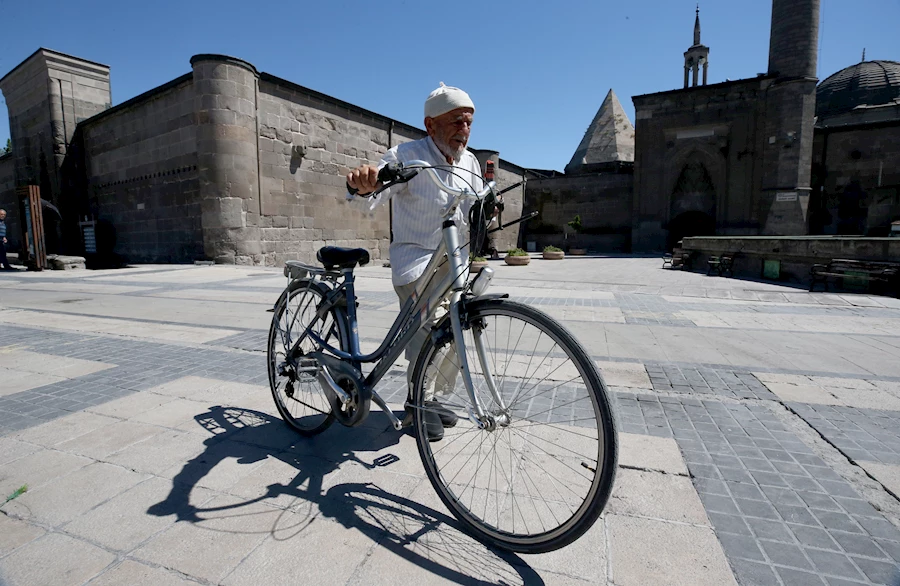 Hacılar ilçesinde ikamet eden Karaimam, evinden bisikletle yola çıkıp kent merkezinin yoğun trafiği arasında ilerleyerek tarihi Hunat Camisi önüne geliyor.