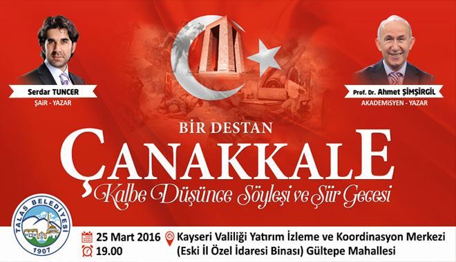 25 Mart Cuma günü saat 19.00´da eski İl Özel İdare Binası Kültür Merkezinde gerçekleşecek programla ilgili açıklamalarda bulunan sunucu, şair-yazar Serdar Tuncer, Çanakkale Zaferi´nin 101. yılı olmasına rağmen hala tam olarak anlaşılamadığını söyledi. Tuncer, "Biz hala Çanakkale´de ne oldu, niye oldu, Çanakkale bugüne ne söyler, Çanakkale´nin söylediğini dinlemezsek ne olur, dinlersek neyi değiştiririz? Bunları biliyoruz maalesef diyemiyoruz. Çanakkale bilincini birazcık artırmak manasında biz yine her zaman olduğu gibi şiirlerimizle Çanakkale anlatımıyla 25 Mart´ta Talas Belediyemizin misafiri olarak Kayserimizde olacağız. Kıymetli bir konuğumuz var; Prof. Dr. Ahmet Şimşirgil. Ahmet Hoca, Osmanlıyı hem seven hem de çok güzel bir üslupla anlatan kıymetli bir isim, mühim bir tarihçimiz. Onunla Çanakkale´yi, Çanakkale´nin bugüne söylediklerini konuşacağız. Bütün dostları bekliyoruz." dedi.