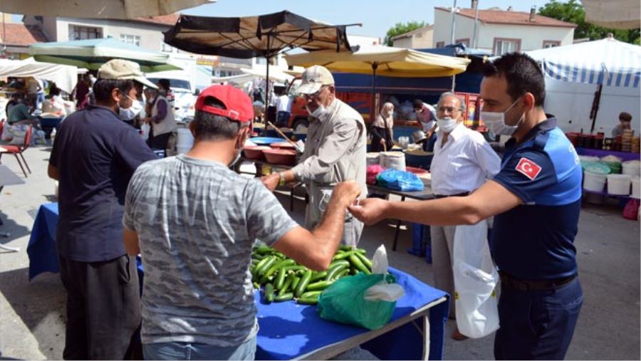 Bünyan Belediyesi zabıta ekipleri ilçede kurulan pazar yerlerinde korona virüsüne karşı sıkı tedbirler uygulamaya devam ediyor.