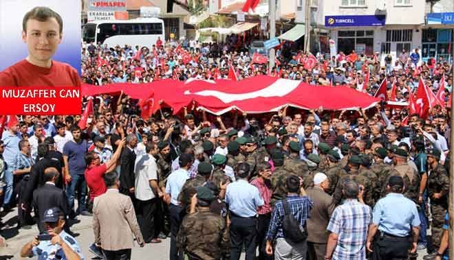 Ersoy´un 6 aylık kızı Zeynep de yakınlarının kucağında babasının cenaze törenine iştirak etti. Anne Ayşe Ersoy´u kadın özel harekat polisleri teselli etmeye çalıştı. Şehidin eşi, babası ve kardeşinin metaneti ise dikkati çekti. Şehit Muzaffer Can Ersoy´un naaşı, burada İl Müftüsü Şahin Güven´in kıldırdığı cenaze namazını ardından ilçe şehitliğinde gözyaşları arasında toprağa verildi.
