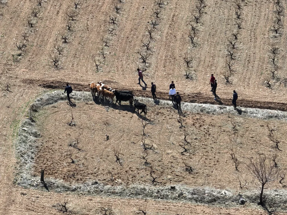 Dron destekli arama faaliyetinde büyükbaş hayvanlar, mandıradan yaklaşık 12 kilometre uzaklıktaki arazide bulundu, Ü.V. ve T.S. hayvanların yakınında gözaltına alındı.