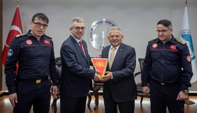 Büyükşehir Belediyesi İtfaiye Daire Başkanı Mustafa Metin Kızılkan, ziyarette, Başkan Büyükkılıç´a 25 Eylül - 1 Ekim tarihleri arasında kutlanacak olan İtfaiye Haftası dolayısıyla yangın tüpü ve itfaiye flaması hediye etti. Daire Başkanı Kızılkan ve teşkilat mensuplarının İtfaiye Haftası´nı tebrik eden Başkan Büyükkılıç, ?Cenab-ı Allah inşallah sizlerin uygulama yapmasını gerektirecek bir felaketle bizi karşı karşıya getirmesin ama yokluğunuzu da vermesin. Lazım olduğunda tabi ki canla başla kendinizi adeta heba edercesine koşturduğunuzu biliyorum. Yüz akımız olan, itfaiye hizmetlerinde örnek ve önder olan ekibimizi tebrik ediyorum. Allah bu ülkeyi, bu şehri kazalardan korusun diye de dua ediyorum? şeklinde konuşarak ziyaretleri için Kayseri Büyükşehir Belediyesi İtfaiye Teşkilatı´na teşekkür etti.