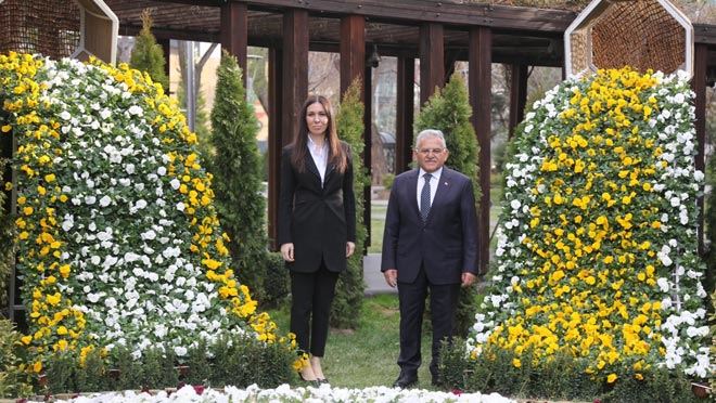 Başkanlık girişinde karşılanan Karaaslan, Başkan Büyükkılıç ile birlikte belediye bahçesinde bir süre sohbet edip, burada hatıra fotoğrafı çektirdi.