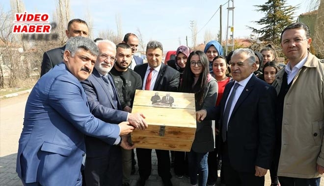 Cumhur İttifakı Kayseri Büyükşehir Belediye Başkan Adayı Memduh Büyükkılıç´a Sarıoğlan ilçesini ziyaretinde üzerinde kendisinin ve eşinin fotoğrafının bulunduğu seçim sandığı hediye edildi.
