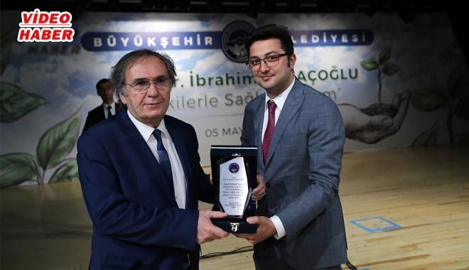 Söyleşi sonrası Büyükşehir Belediyesi Kültür ve Sosyal İşler Daire Başkanı Salih Özgöncü, Prof. Dr. İbrahim Sraçoğlu´na günün anısına plaket takdim etti.