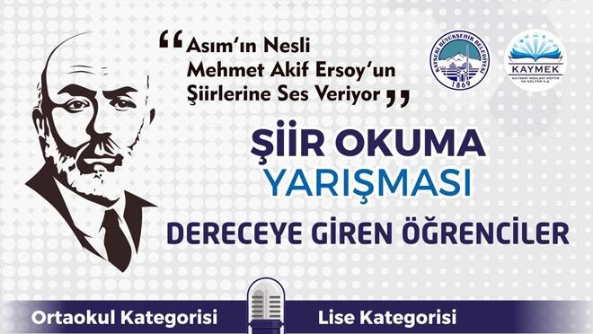 Büyükşehir Belediyesi bünyesindeki KAYMEK A.Ş. tarafından düzenlenen ve 781 ortaokul, 234 lise öğrencisi olmak üzere toplam bin 15 öğrenci katıldığı ‘Asım’ın Nesli, Akif’in Şiirlerine Ses Veriyor’ Şiir Okuma Yarışması sonuçları açıklandı.