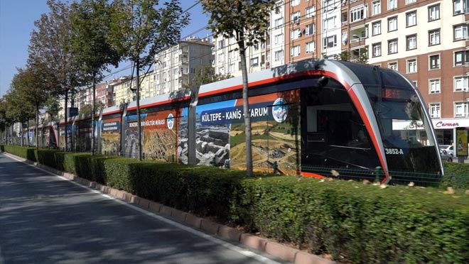 Kayseri’de gün içerisinde binlerce kilometre yol yapan tramvaylar, bu seyahatleri sırasında adeta tarihe yolculuk yaparcasına şehrin tarihi değerlerini tanıtıyor. UNESCO Dünya Mirası Geçici Listesi’ne giren Koramaz Vadisi ile Kültepe Kaniş- Karum’un görselleriyle donatılan tramvayla tarihi ve kültürel mirasın tanıtımına katkı sağlıyor.