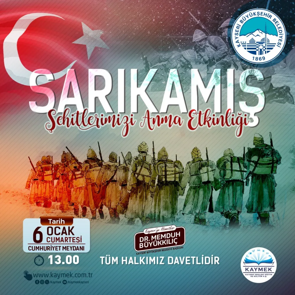 Kayseri Büyükşehir Belediyesi’nin mesleki eğitim ve kültüre yönelik faaliyetlerini yürüten Kayseri Mesleki Eğitim ve Kültür A.Ş. (KAYMEK) tarafından, Sarıkamış Şehitlerini Anma Programı düzenlenecek. Programda kahraman ecdadın şehit olma anı canlandırılarak, şehitler rahmetle ve minnetle anılacak.