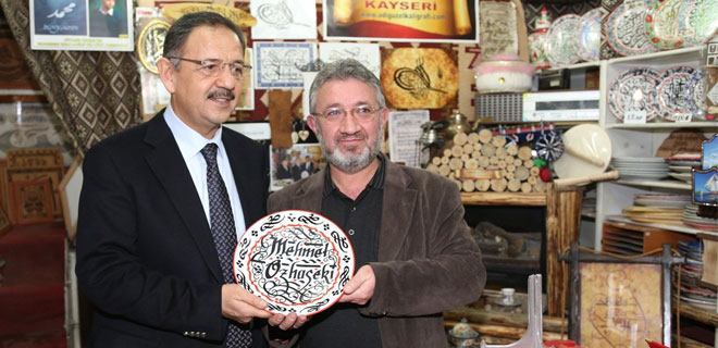 Esnafla yaptığı toplantının ardından medrese içindeki dükkanları gezen Başkan Özhaseki`ye, hat sanatı ile `Mehmet Özhaseki` yazılmış bir tablo hediye edildi.