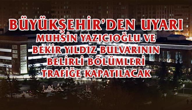 Çalışmalar esnasında vatandaşlarımızın can ve mal güvenliğinin sağlanabilmesi için sabah saat 08.00 ile akşam 18.00 saatleri arasında Muhsin Yazıcıoğlu Bulvarı´nın Hurdacılar Sitesi kavşağı ile Mobilyakent Kavşağı arası ve Bekir Yıldız Bulvarı´nın KASKİ su deposu kavşağından (Kocasinan Belediyesi asfalt şantiyesi girişindeki kavşak) Muhsin Yazıcıoğlu Bulvarı´na kadar olan kısım taşıt trafiğine kapatılacak. Yolun kapalı olacağı 25 Kasım 2017 ve 2 Aralık 2017 tarihlerinde alternatif erişim yollarının kullanılması istendi.