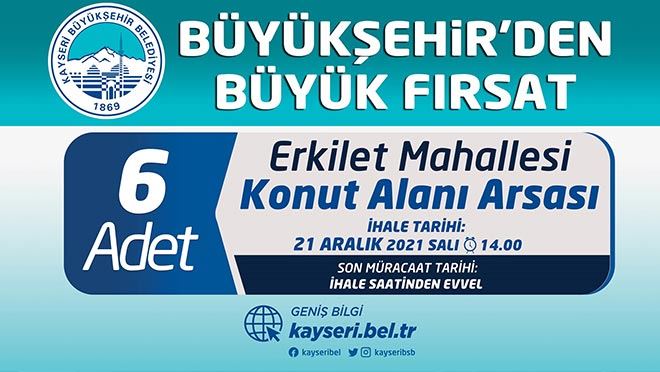 Kayseri Büyükşehir Belediyesi tarafından Kocasinan ilçesi Erkilet Mahallesi’nde bulunan 6 adet konut alanı arsası “Kapalı Teklif Usulü” ihale ile satışa çıkarıldı.