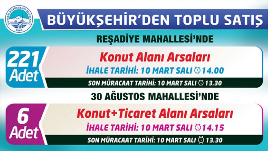 Kayseri Büyükşehir Belediyesi, 30 Ağustos Mahallesi’nde yer alan 6 adet konut+ticaret alanı arsası ile Talas-Reşadiye Mahallesi’nde bulunan 221 adet konut alanı arsasının satışı için ihale yapacak. Her iki ihale de 10 Mart Salı günü gerçekleştirilecek.