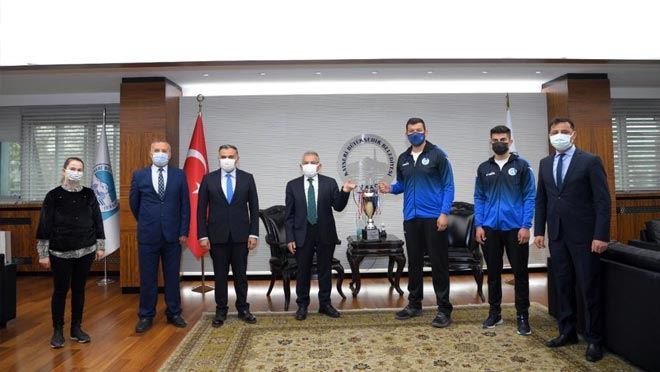 Develi Belediye Başkanı Mehmet Cabbar, 2020-2021 Voleybol 2. Lig sezonunda başarı göstererek 1. Lige yükselen Develi Belediyespor oyuncuları ve yöneticileri ile birlikte Kayseri Büyükşehir Belediye Başkanı Memduh Büyükkılıç’ı makamında ziyaret ettiler.
