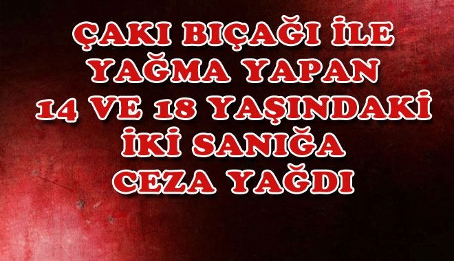 3 kişiyi çakı bıçağı ile korkutarak mont, ayakkabı, cep telefonu ve 10 TL paralarını aldıkları iddiasıyla tutuklu yargılanan 14 ve 18 yaşlarındaki iki sanığa toplam 28 yıl 2 ay 10 gün hapis cezası verildi.