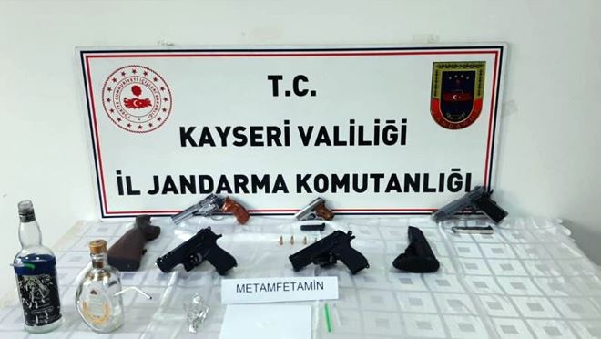 Kayseri İl Jandarma Komutanlığı İstihbarat Şube Müdürlüğü ekipleri tarafından yapılan istihbari çalışmalarda, Ö.F.D.’nin Melikgazi ilçesine bağlı Anbar Mahallesi’nde bulunan Nakliyeciler Sitesi’nde bir iş yerinde satışa sunmak maksadıyla ruhsatsız tabanca bulundurduğu bilgisine ulaşıldı. Adrese ekiplerle beraber bomba arama köpeği ile düzenlenen operasyonda yapılan aramalarda kurusıkı tabancadan dönme 1 adet ve 2 adet ruhsatsız tabanca, 1 adet 9 mm. çapında el yapımı olduğu değerlendirilen ruhsatsız tabanca ile 1 adet tabancaya dönüştürülmek üzere kuru sıkı tabanca olmak üzere toplam 5 adet tabanca, 4 adet tabanca şarjörü, 2 adet av tüfeği dipçiği, 3 adet tabanca mermisi, yaklaşık 3 gr. ağırlığında uyuşturucu madde ve 2 adet uyuşturucu kullanma aparatı bulundu.