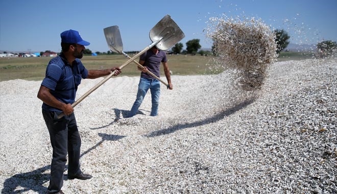 Güneşlenmesi için geniş ve düz alanlara serilen "şemşamer"i sürekli karıştıran çiftçiler, sıcak havada gün boyu tarlada çalışıyor.