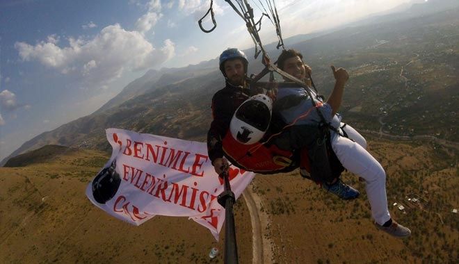 Kayseri´de bir genç, yamaç paraşütü ile atladıktan sonra kız arkadaşına evlenme teklif etti. Sevdiği kızı şoka uğratan genç, ?Tepeden atlamak gibi oldu ama benimle evlenir misin´ sorusuna ?evet´ cevabını aldı.
