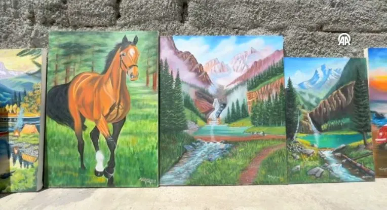 Deneme yanılma yöntemiyle kendi imkanları sayesinde resim yapmayı öğrendiğini ifade eden Yücel, 2 sergi açmayı başardığını dile getirdi.