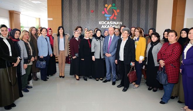 Kocasinan Belediye Başkanı Ahmet Çolakbayrakdar ve eşi Fatma Çolakbayrakdar ? 8 Mart Dünya Kadınlar Günü´ vesilesi ile Kocasinan Akademi Yakut´ta tertiplenen etkinliğe iştirak ederek ilçe kadınları ile buluştu? Kocasinan ilçesinin hemen hemen her kesiminden hanımların yer aldığı etkinlikte katılımcılarla samimi ve hoş sohbetler gerçekleştiren Çolakbayrakdar çifti konuklarına´ Kocasinan Akademi´yi gezdirip tesis hakkında detaylı bilgiler aktardı. Tesisin son teknoloji ürünü aletlerle donatılmış dersliklerini, el sanatları kurs odalarını, spor alanlarını ve havuzunu tek tek gezdiren çift Kocasinan´lı hanımların bu tesis ile ayrıcalık kazandığını vurguladı?