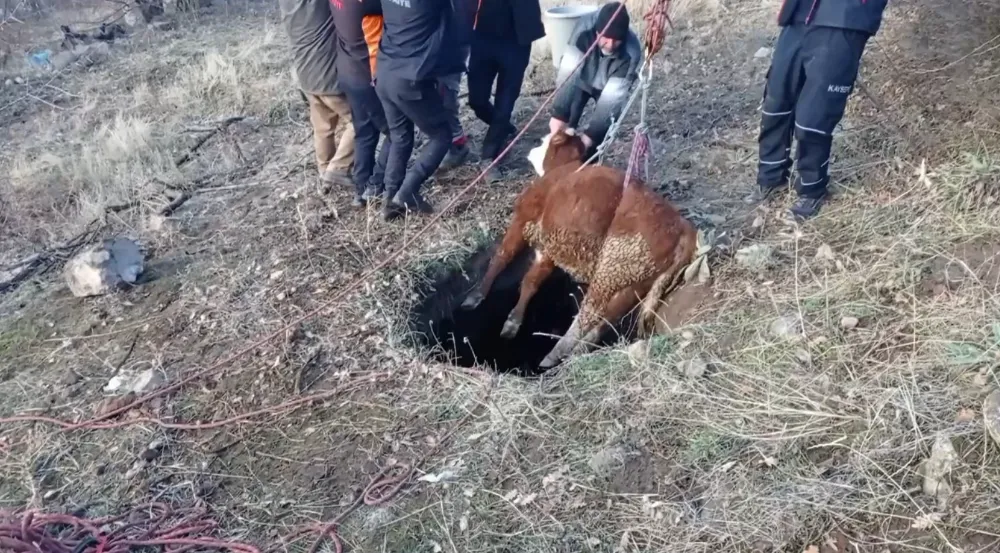 Kayseri'de düştüğü çukursa mahsur kalan buzağı, itfaiye ekipleri tarafından kurtarılarak sahibine teslim edildi.