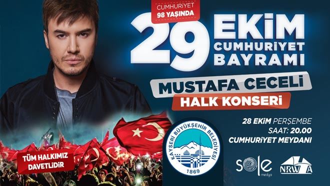Büyükşehir Belediyesi tarafından düzenlenen Cumhuriyet Bayramı etkinlikleri kapsamında 28 Ekim Perşembe akşamı saat 20.00’de ünlü sanatçı Mustafa Ceceli, Kayserililer ile buluşacak. Cumhuriyet Meydanı’nda halka açık ücretsiz konserde binlerce Türk Bayrağı da dağıtılacak.
