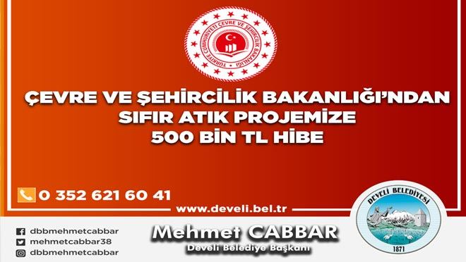 Çevreci belediyecilik anlayışından ödün vermeden en büyük emanet olan çevreyi koruyarak, daha yaşanılabilir Develi için çalışmalara hız kesmeden devam edeceğini belirten Develi Belediye Başkanı Mehmet Cabbar “Projemiz kapsamında geri dönüşümün önemini vurgulamak üzere mobil atık getirme merkezi, iç mekân kutuları, çöp konteynırı vs. alınacaktır. Projemizin hayata geçmesiyle Sayın Cumhurbaşkanımız Recep Tayyip Erdoğan’ın ülkemiz genelinde başlattığı sıfır atık seferberliğine Develimiz adına önemli bir katma değer üreteceğiz. Projemize desteklerinden ve 500 bin TL’lik hibenin belediyemize kazandırılmasında emeği geçen Çevre ve Şehircilik önceki dönem bakanımız Mehmet Özhaseki’ye ve bakanlığımıza çok teşekkür ediyor, Develimize hayırlı, uğurlu olmasını diliyorum” dedi.