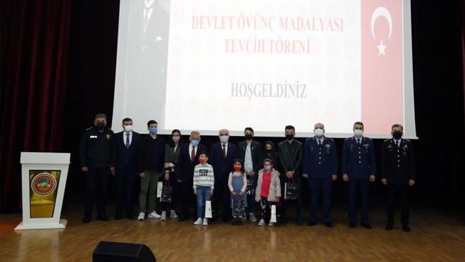Cumhurbaşkanı Recep Tayyip Erdoğan tarafından ilimizdeki 3 şehit ailemize ve 10 gazimize gönderilen “Devlet Övünç Madalyaları” düzenlenen tören ile hak sahiplerine Vali Şehmus Günaydın tarafından verildi.