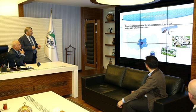 Büyükşehir Belediye Başkanı Mustafa Çelik, Kayseri´de Güneş Enerjisi ile ilgili Organize Sanayi Bölgesi kurulması için Ekonomi Bakanı Mustafa Elitaş´a detaylı bir sunum yaptı. Büyükşehir Belediyesi Başkanlık makamında gerçekleştirilen sunumu Vali Orhan Düzgün, AK Parti İl Başkanı Hüseyin Cahit Özden, Melikgazi Belediye Başkanı Memduh Büyükkılıç ve Kocasinan Belediye Başkanı Ahmet Çolakbayrakdar da izledi.