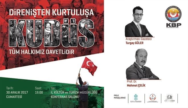 Kayseri Buluşmaları Platformu Başkanı Ali Karagöz, Kudüs konusuna dikkat çekmek amacıyla bir etkinlik düzenlediklerini vurgulayarak, ?Peygamber Efendimizin Miraç´a yükseldiği yer olan Kudüs, bütün Müslümanların ortak davasıdır. İlk kıblemiz olanKudüs´un Müslümanlar için ne kadar önemli olduğunu özellikle bu günlerde anlatmak için ?Direnişten Kurtuluşa - Kudüs´ etkinliğini düzenliyoruz. Amacımız, Kudüs bilincini artırmaktır. Zira; Sayın Cumhurbaşkanımızın da dediği gibi; ?Kudüs bizim kırmızı çizgimizdir´. Bu düşünceyle 30 Aralık Cumartesi Günü saat 19.00´ da İl Kültür ve Turizm Müdürlüğü Konferans Salonu´nda Araştırmacı Gazeteci Turgay Güler ve Tarihçi Prof. Dr. Mehmet Çelik´in katılımlarıyla düzenleyeceğimiz ve sunuculuğunu Selda Polat ile Muharrem Öztürk´ün yapacağı etkinliğimize tüm halkımızı davet ediyoruz.? ifadelerini kullandı.