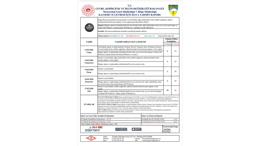 Yahyalı, Develi, Tomarza, Sarız, Pınarbaşı ve Erciyes çevresinde yer yer kuvvetli yağış beklenirken, yüksek kesimlerde karla karışık yağmur ve kar görülebileceği ifade edildi. Meteoroloji yetkilileri, çatı uçması, ağaç devrilmesi ve ulaşımda aksamalar gibi risklere karşı uyarıda bulundu.
