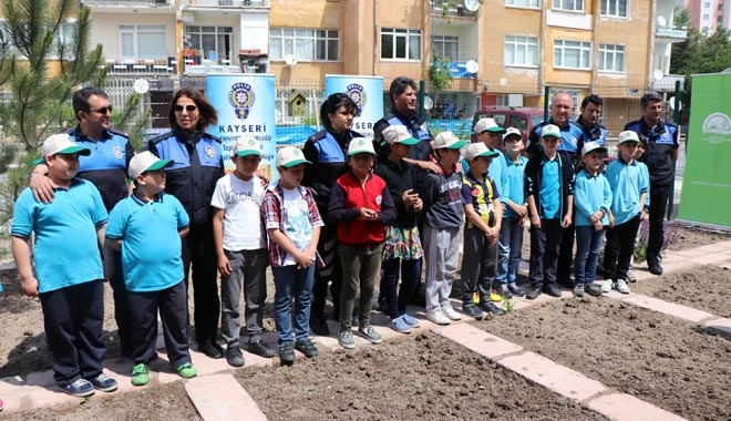 Kayseri İl Emniyet Müdürlüğü Toplum Destekli Polislik Şube Müdürlüğü tarafından ÇOGEP Programı kapsamında yürütülen ?Genç Bakışlar, Mutlu Yüzler´ Projesi kapsamında 40 öğrenci, oluşturulan hobi bahçesine fide dikti.