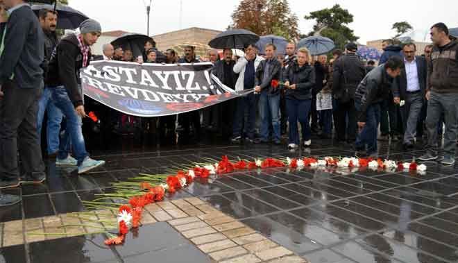 Kent meydanına gelen sendika üyeleri, burada yere kırmızı karanfil bırakarak, patlamada hayatını kaybedenler için saygı duruşunda bulundu. Burada bir açıklama yapan Eğitim-Sen Kayseri Şube Başkanı Ulaş Apaydın, patlamada hayatını kaybedenleri anma için 2 günlük greve başladıklarını söyledi. Apaydın, faillerin de biran önce bulunmalarını istediklerini dile getirerek, alanda güvenlik zafiyeti bulunduğunu kaydetti.