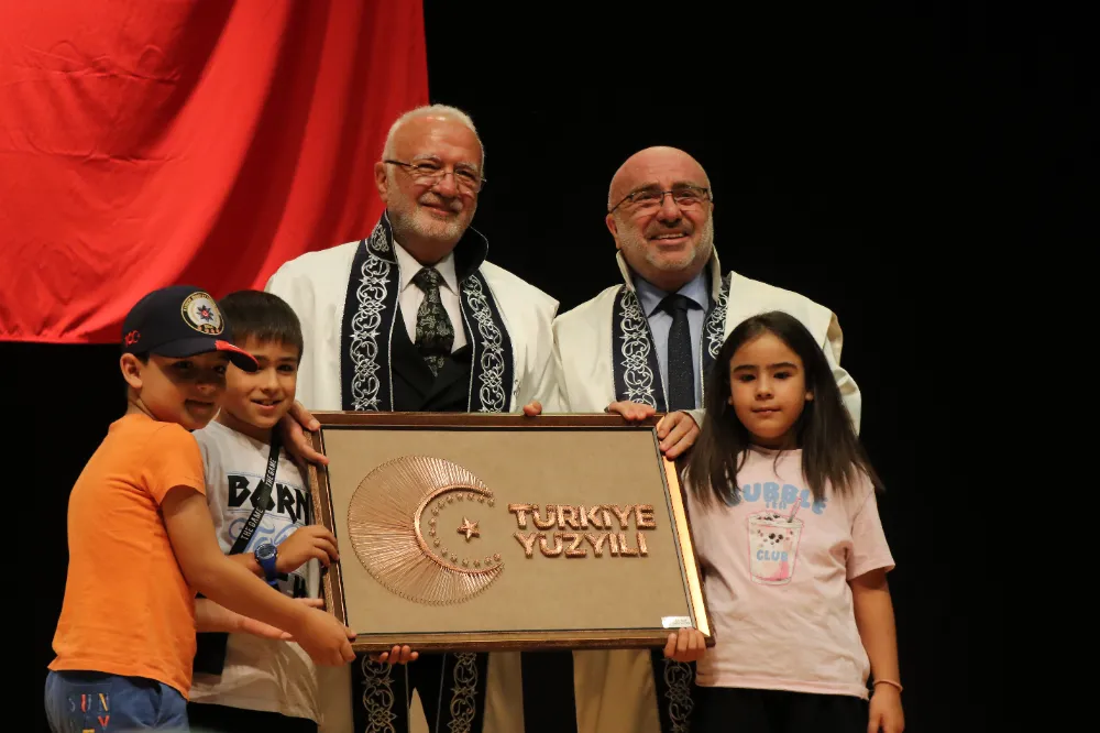 Konuşmanın ardından KAYÜ Rektörü Prof. Dr. Kurtuluş Karamustafa, üniversite senatosunca Elitaş'a verilen fahri doktora belgesini takdim etti, cübbesini giydirdi.