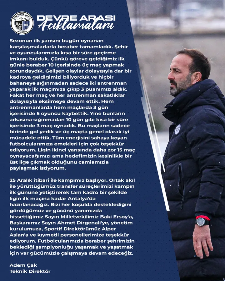 Türkiye Futbol Federasyonu 3. Lig 2. Grup’ta ilk yarının tamamlanmasının ardından Erciyes 38 FK Teknik Direktörü Adem Çak, kulübün sosyal medya hesapları üzerinden değerlendirmede bulundu.