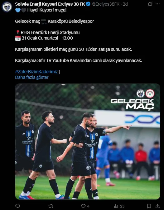 Kayseri’yi profesyonel liglerde temsil eden Erciyes 38 FK, hafta sonu oynanacak kritik mücadele öncesinde taraftarlarına çağrıda bulundu. Mavi-siyahlı ekip, Karaköprü Belediyespor ile karşı karşıya geleceği maçta Kayserilileri tribünlerde görmek istiyor.