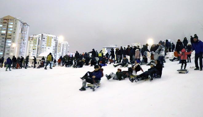 Karın etkili olduğu Kayseri´de, merkez Talas ilçesi Mevlana Mahallesi´ndeki Rifat Yıldırım Parkı´nı dolduran çocuklar, yanlarına aldıkları fırın tepsisi, poşet, naylon, leğen ve kızaklarla gece geç saatlere kadar kayarak eğlendi.