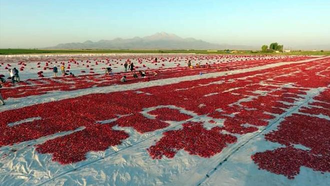 Kayseri'nin Yeşilhisar ilçesinde kurutulmak için serilen domatesler, tarlaları kırmızıya boyadı.